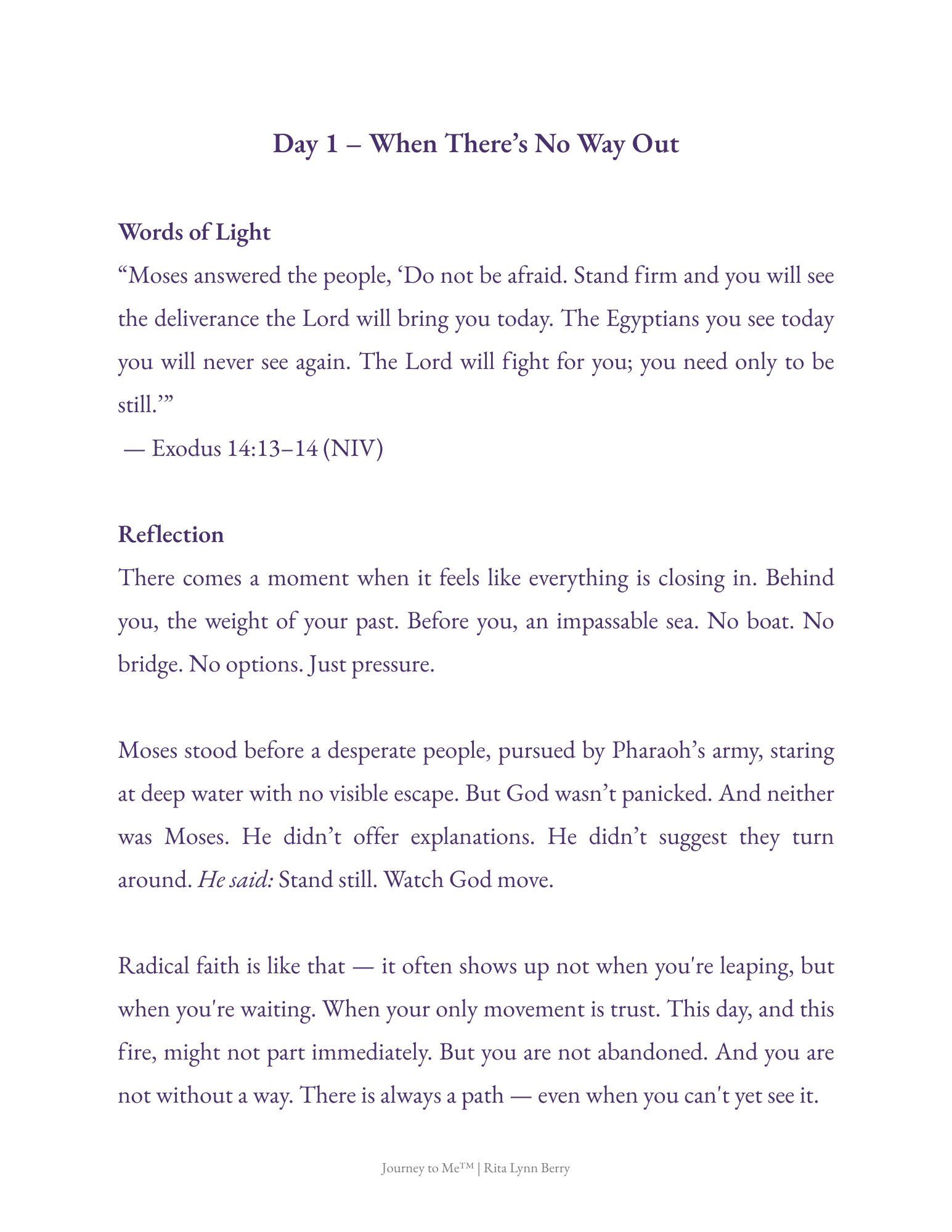 Rooted in 7 biblical moments of profound uncertainty—Moses at the Red Sea, Hagar in the wilderness, Jesus in Gethsemane, and more—each day walks you through one powerful truth: God shows up in the fire.